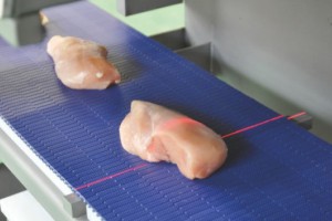 Scanning and measurement of irregular meat are used, analytical calculation by software, which can get the product cutting thickness and do the horizontal cutting. Then it can make sure the required thickness and weight. It can be connected with intelligent portion cutter to realize the automatically cutting for chicken steak. It can apply to the horizontal cutting for poultry and fish.